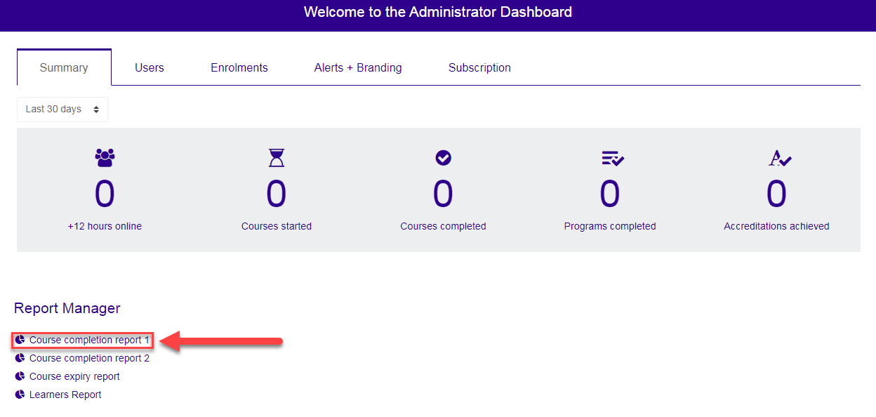 To see all of your users’ progress at once, you can run a report. To do this, at the bottom of the "Summary" or "Users" tab, click one of the options under the Report Manager menu:
