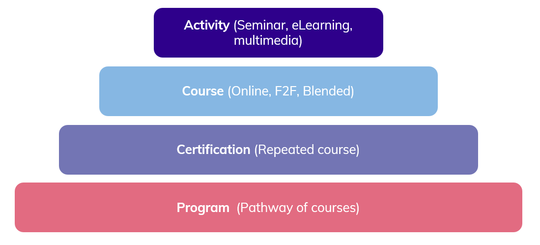 Activities are learning activities within courses, such as Seminar events, eLearning modules or other online content.